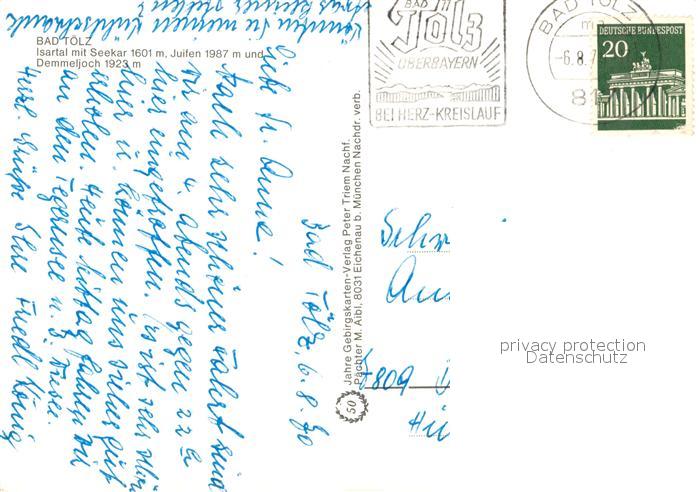 73165853 alte Postkarte Bad Toelz Fliegeraufnahme Isartal mit Seekar Demmeljoch postalisch gelaufen Erhaltung siehe scans [LiesaD40] KatCode: 11110009173112