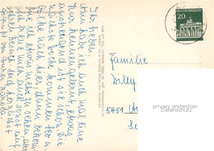 73726191 alte Postkarte Bad Toelz Fliegeraufnahme Isartal Tiroler Alpen postalisch gelaufen Erhaltung siehe scans [LiesaD40] KatCode: 11110009173112