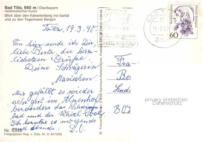 72797753 alte Postkarte Bad Toelz Heilklimatischer Kurort Blick ueber den Kalvarienberg Isartal Tegernseer Bergen Fliegeraufnahme postalisch gelaufen Erhaltung siehe scans [FriedD77] KatCode: 11110009173112
