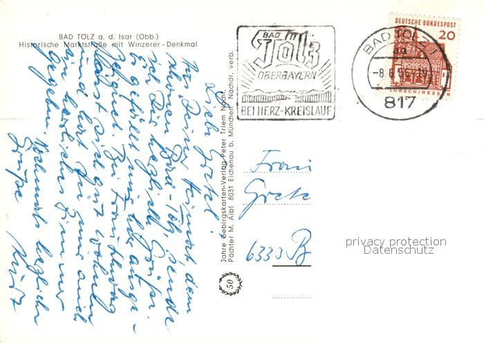 73249191 alte Postkarte Bad Toelz Historische Marktstrasse mit Winzerer Denkmal postalisch gelaufen Erhaltung siehe scans [FriedD77] KatCode: 11110009173112