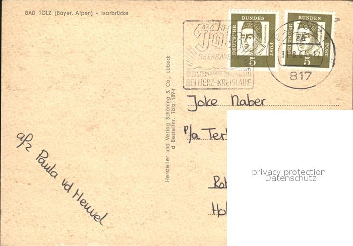 72469984 alte Postkarte Bad Toelz Isarbruecke postalisch gelaufen Erhaltung siehe scans KatCode: 11110009173112