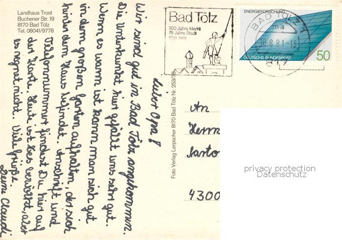 73774727 alte Postkarte Bad Toelz Landhaus Trost postalisch gelaufen Erhaltung siehe scans [WerneD78] KatCode: 11110009173112