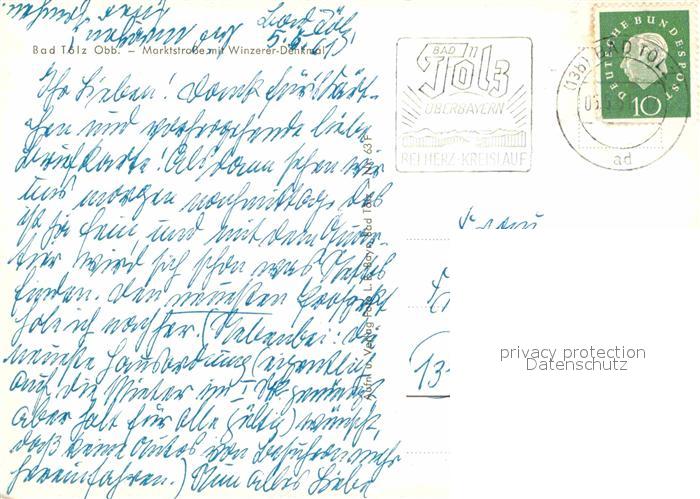 72856376 alte Postkarte Bad Toelz Marktstrasse mit Winzerer Denkmal postalisch gelaufen Erhaltung siehe scans [WerneD78] KatCode: 11110009173112