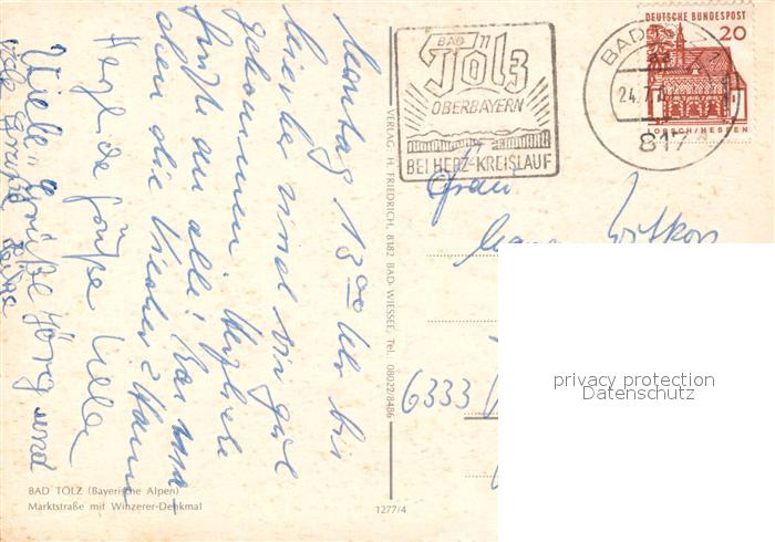 73249173 alte Postkarte Bad Toelz Marktstrasse mit Winzerer Denkmal postalisch gelaufen Erhaltung siehe scans [FriedD77] KatCode: 11110009173112