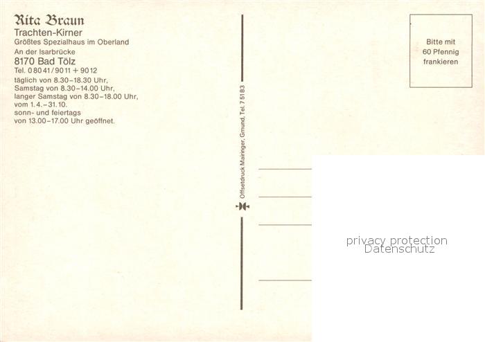 73160726 Bad Toelz Trachten Kirner Rita Braun postalisch nicht gelaufen Erhaltung siehe scans [KathaD81] KatCode: 11110009173112