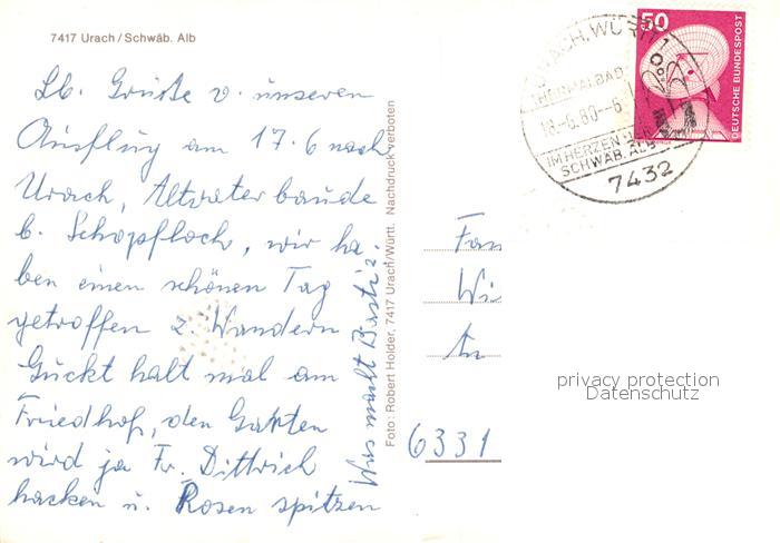 73147241 alte Postkarte Bad Urach Kurort Schwaebische Alb Burgruine Hohenurach Residenzschloss Wasserfall Brunnen Hallenbad postalisch gelaufen Erhaltung siehe scans [FriedD77] KatCode: 11110008415078