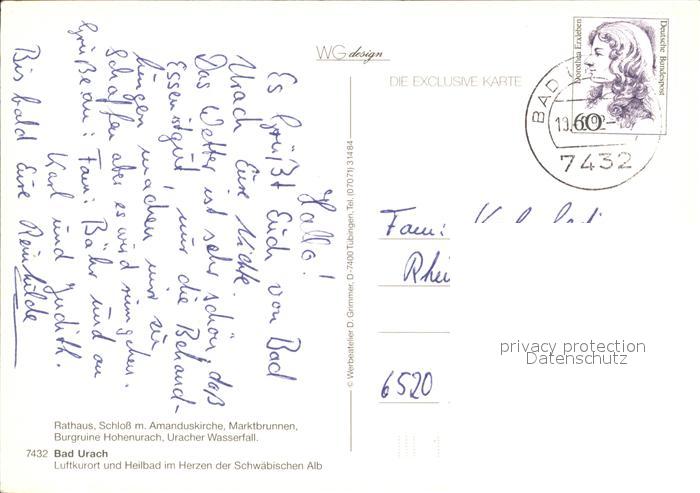72107196 alte Postkarte Bad Urach Rathaus Schloss Amanduskirche Marktbrunnen Burgruine Hohenurach Wasserfall postalisch gelaufen Erhaltung siehe scans KatCode: 11110008415078