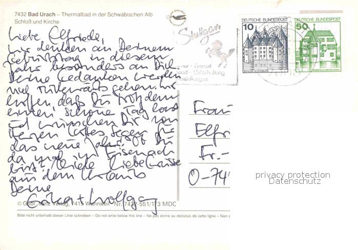 72859091 alte Postkarte Bad Urach Schloss Kirche postalisch gelaufen Erhaltung siehe scans [AndreD76] KatCode: 11110008415078