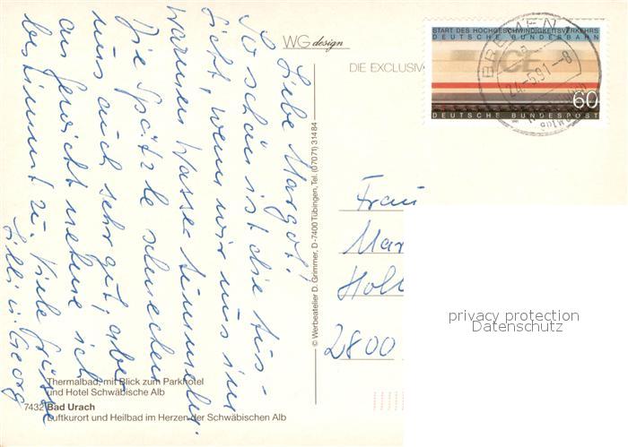 73720722 alte Postkarte Bad Urach Thermalbad m. Blick zum Parkhotel u. Hotel Schwaebisch Alb postalisch gelaufen Erhaltung siehe scans [LiesaD40] KatCode: 11110008415078