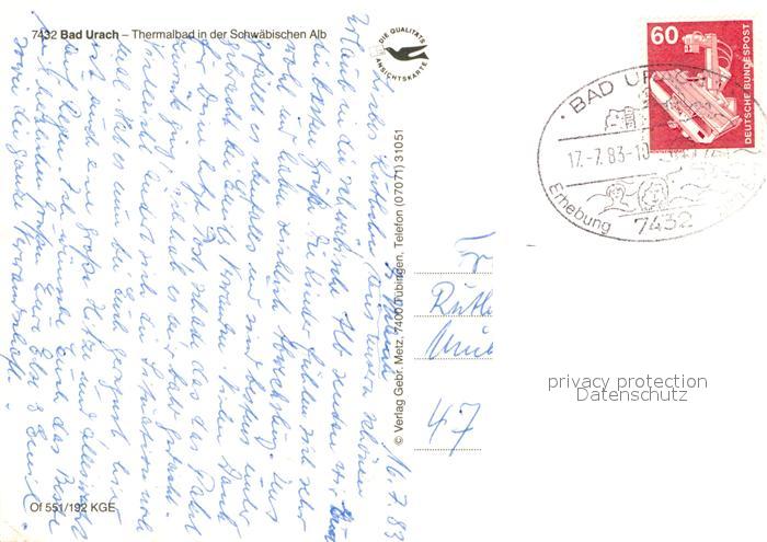 73013580 alte Postkarte Bad Urach Thermalbad Marktbrunnen Panorama Wasserfall Fachwerkhaeuser Schwimmbad postalisch gelaufen Erhaltung siehe scans [WerneD78] KatCode: 11110008415078