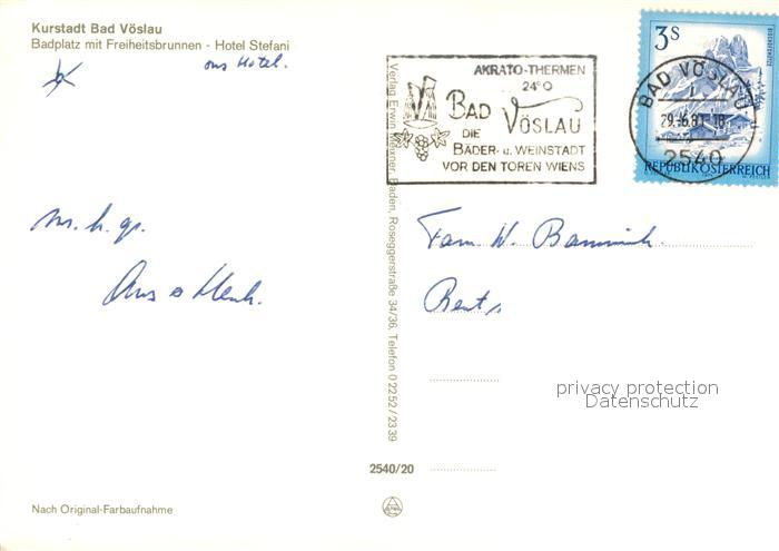 13212986 alte Postkarte Bad Voeslau Badplatz mit Freiheitsbrunnen Hotel Stefani postalisch gelaufen Erhaltung siehe scans [LiesaD40] KatCode: 11390127030603