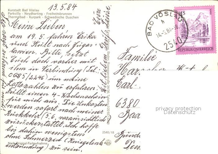 72498900 alte Postkarte Bad Voeslau Parkvilla Neydharting Freiheitsbrunnen Thermalbad Kurpark Schwedische Duschen postalisch gelaufen Erhaltung siehe scans KatCode: 11390127030603