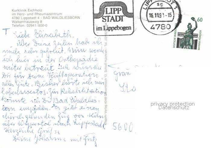 72678550 alte Postkarte Bad Waldliesborn Kurklinik Eichholz Herzzentrum Rheumazentrum postalisch gelaufen Erhaltung siehe scans [FriedD77] KatCode: 11110005974028