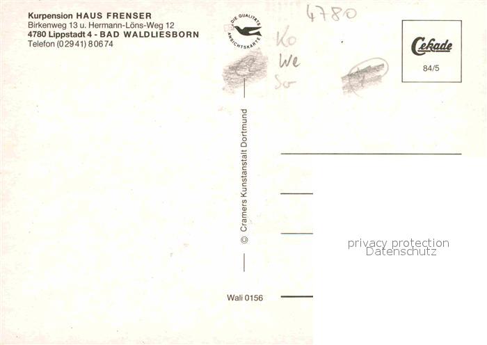 72815387 Bad Waldliesborn Kurpension Haus Frenser postalisch nicht gelaufen Erhaltung siehe scans [NatalD47] KatCode: 11110005974028