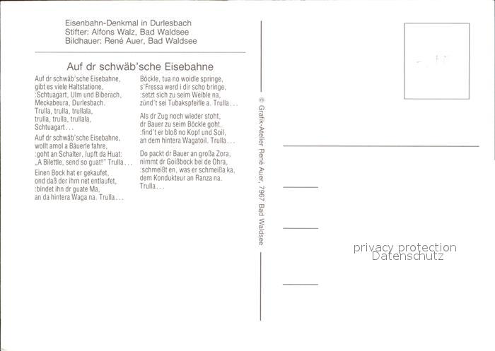72323481 Bad Waldsee Eisenbahn Denkmal in Durlesbach Gedicht postalisch nicht gelaufen Erhaltung siehe scans KatCode: 11110008436009