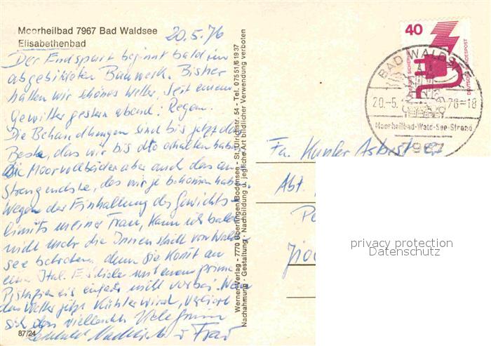 72835070 alte Postkarte Bad Waldsee Elisabethenbad Moorheilbad Kurort postalisch gelaufen Erhaltung siehe scans [FriedD77] KatCode: 11110008436009