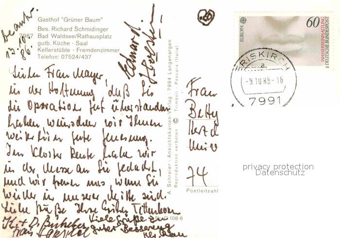 72875614 alte Postkarte Bad Waldsee Gasthof zum gruenen Baum Restaurant Stadtsee Kirche postalisch gelaufen Erhaltung siehe scans [FriedD77] KatCode: 11110008436009