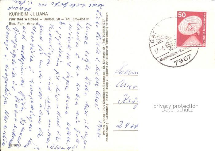 72535943 alte Postkarte Bad Waldsee Kurheim Juliana postalisch gelaufen Erhaltung siehe scans [LiesaD40 kt120box] KatCode: 11110008436009