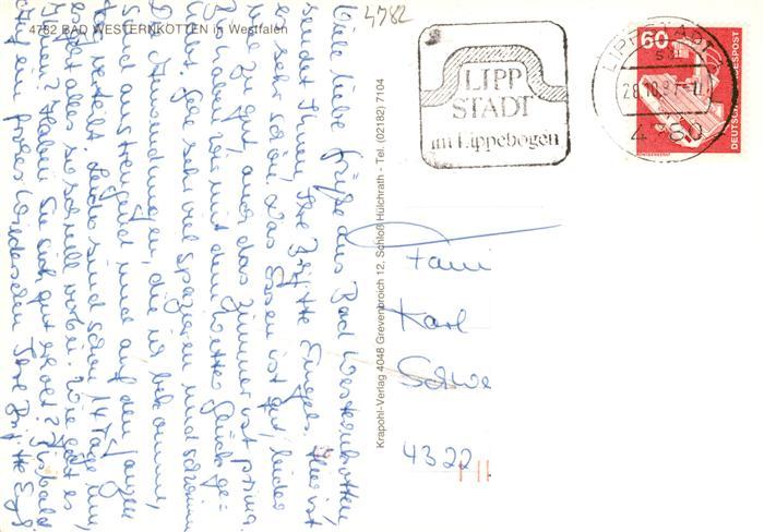 73934503 alte Postkarte Bad Westernkotten Hellweg Sole Thermen Vitaminbar Sanatorium Wiesengrund Saline im Kurpark Sanatorium Solequelle Steinmaennchen Sanatorium Muehlenweg Hellweg Sole Thermen postalisch gelaufen Erhaltung siehe scans [WerneD78] KatCode: 11110005974016