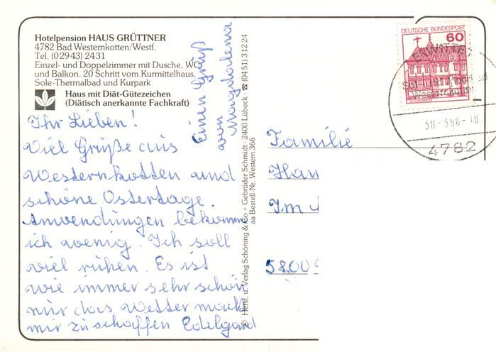73896573 alte Postkarte Bad Westernkotten Hotel Pension Haus Gruettner Restaurant postalisch gelaufen Erhaltung siehe scans [FriedD77] KatCode: 11110005974016