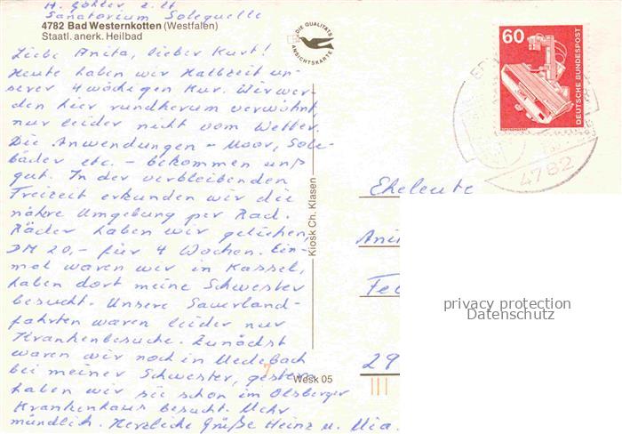 74150403 alte Postkarte Bad Westernkotten Kath Kirche Brunnen Kurhaus Kurpark Kurhalle Saline postalisch gelaufen Erhaltung siehe scans [WerneD78] KatCode: 11110005974016