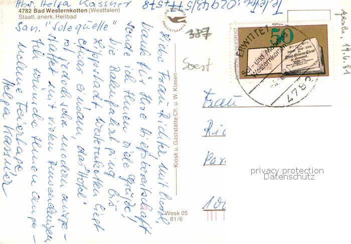 72904797 alte Postkarte Bad Westernkotten Katholische Kirche Kurpark Kurhalle Saline Kurhaus postalisch gelaufen Erhaltung siehe scans [AndreD76] KatCode: 11110005974016