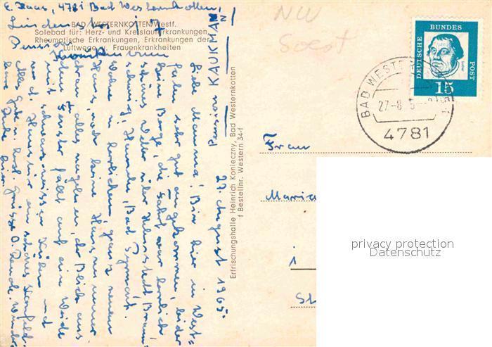 72904798 alte Postkarte Bad Westernkotten Saline Wandelhalle Fachwerkhaeuser Kirche Kurmittelhaus Leseraum postalisch gelaufen Erhaltung siehe scans [AndreD76] KatCode: 11110005974016