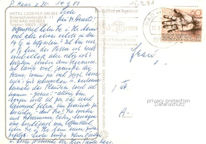 73152525 alte Postkarte Bad Wiessee Hotel Lederer Ansicht vom See aus postalisch gelaufen Erhaltung siehe scans [FriedD77] KatCode: 11110009182111