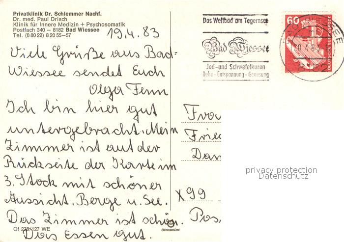 73722617 alte Postkarte Bad Wiessee Privatklinik dr. Schlemmer Aussenansicht postalisch gelaufen Erhaltung siehe scans [LiesaD40] KatCode: 11110009182111