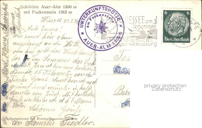 71725934 alte Postkarte Bad Wiessee Skihuette Auer Alm mit Fockenstein postalisch gelaufen Erhaltung siehe scans KatCode: 11110009182111