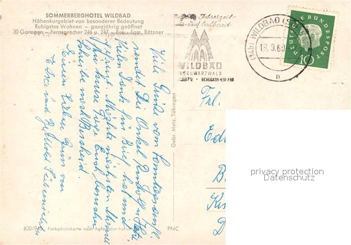 73230403 alte Postkarte Bad Wildbad Sommerberghotel Restaurant Terrasse Blick ins Tal Schwarzwald postalisch gelaufen Erhaltung siehe scans [FriedD77] KatCode: 11110008235079