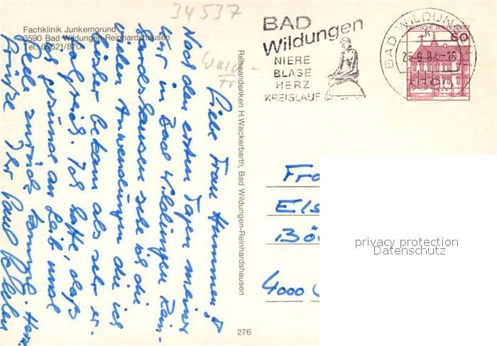 73332126 alte Postkarte Bad Wildungen Fachklinik Junkerngrund Reinhardshausen postalisch gelaufen Erhaltung siehe scans [LiesaD40] KatCode: 11110006635003
