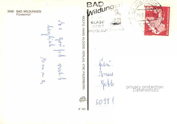 72839625 alte Postkarte Bad Wildungen Fuerstenhof postalisch gelaufen Erhaltung siehe scans [AndreD76] KatCode: 11110006635003