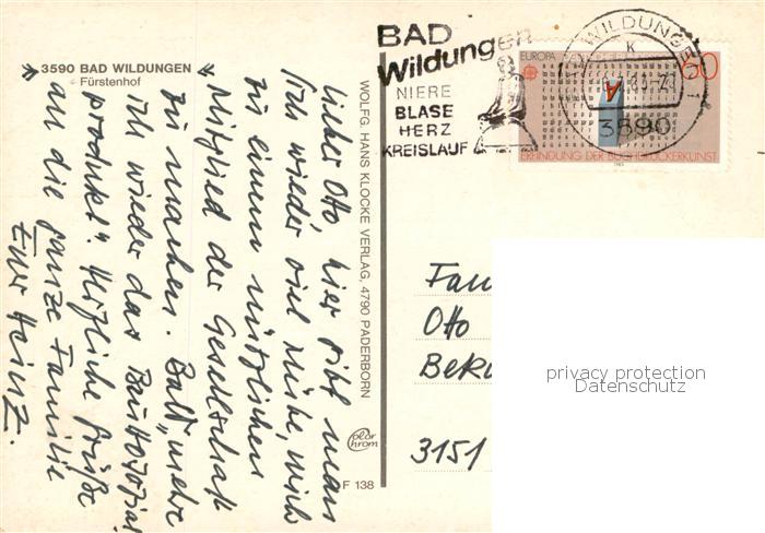 73766077 alte Postkarte Bad Wildungen Fuerstenhof postalisch gelaufen Erhaltung siehe scans [FriedD77] KatCode: 11110006635003