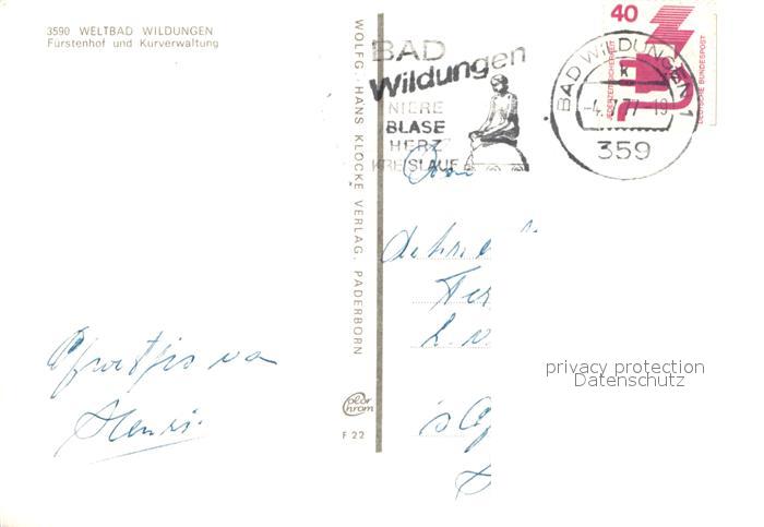 72942135 alte Postkarte Bad Wildungen Fuerstenhof und Kurverwaltung postalisch gelaufen Erhaltung siehe scans [FriedD77] KatCode: 11110006635003