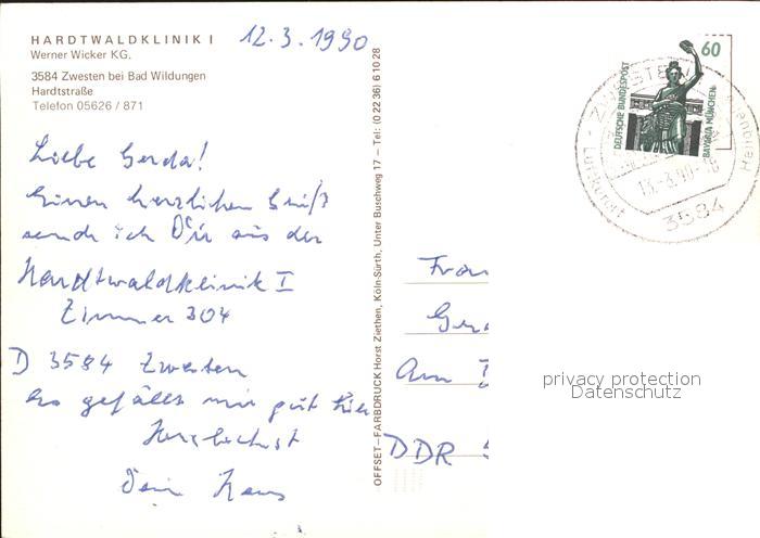 71929474 alte Postkarte Bad Wildungen Hardtwaldklinik Werner Wicker KG Zwesten postalisch gelaufen Erhaltung siehe scans KatCode: 11110006635003