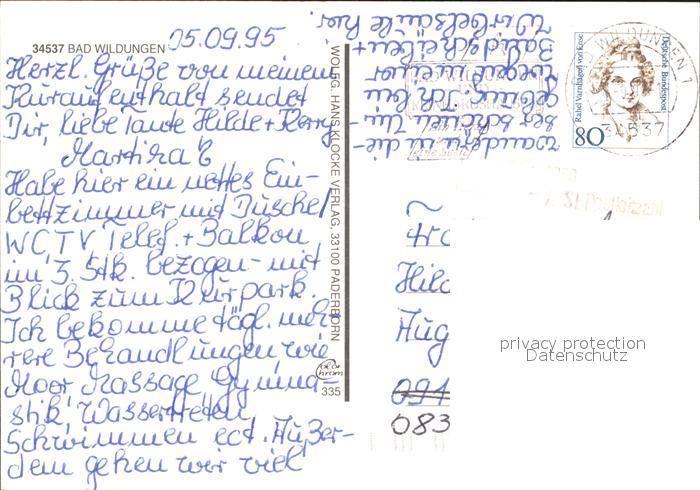 72372375 alte Postkarte Bad Wildungen Kurklinik Helenenquelle Stadtkirche Fachwerkhaus Altstadt Wandelhalle Konzertmuschel Springbrunnen postalisch gelaufen Erhaltung siehe scans KatCode: 11110006635003