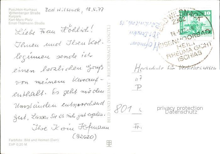 72352692 alte Postkarte Bad Wilsnack Puschkin Kurhaus Wittenberger Strasse Kurpark Karl Marx Platz Ernst Thaelmann Strasse postalisch gelaufen Erhaltung siehe scans KatCode: 11110012070008