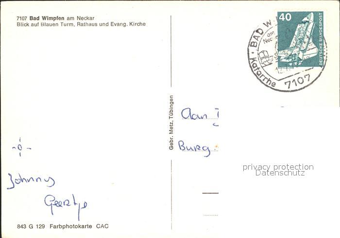 72172925 alte Postkarte Bad Wimpfen Blaue Turm Rathaus Evangelische Kirche postalisch gelaufen Erhaltung siehe scans KatCode: 11110008125007