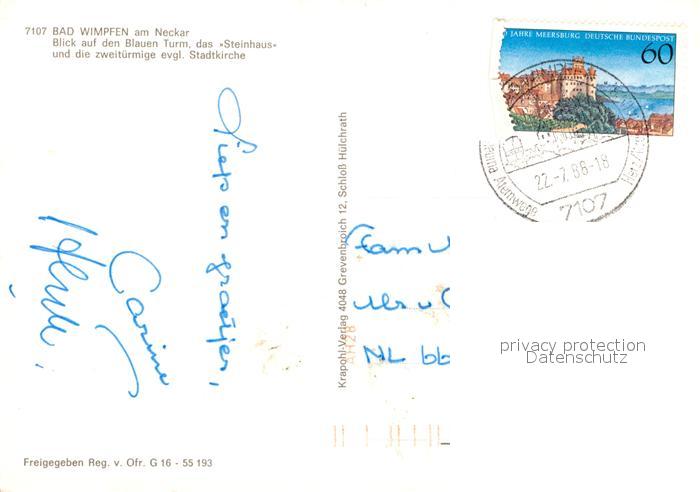72930983 alte Postkarte Bad Wimpfen Blauer Turm Steinhaus Ev Stadtkirche Neckar Fliegeraufnahme postalisch gelaufen Erhaltung siehe scans [WerneD78] KatCode: 11110008125007
