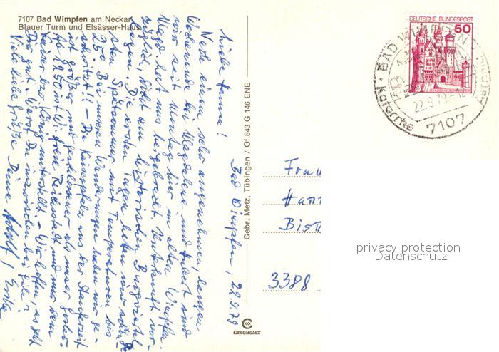 73125707 alte Postkarte Bad Wimpfen Blauer-Turm und Elsaesser-Haus postalisch gelaufen Erhaltung siehe scans [LiesaD40] KatCode: 11110008125007