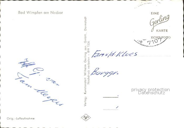 72201754 alte Postkarte Bad Wimpfen Fliegeraufnahme mit Neckar postalisch gelaufen Erhaltung siehe scans KatCode: 11110008125007