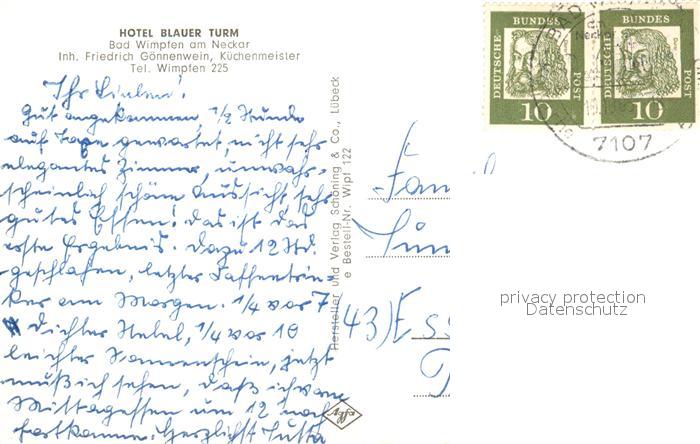 73323180 alte Postkarte Bad Wimpfen Hotel Blauer Turm Restaurant Kamin postalisch gelaufen Erhaltung siehe scans [FriedD77] KatCode: 11110008125007