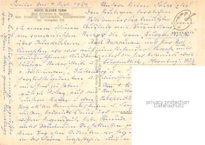73054750 alte Postkarte Bad Wimpfen Hotel Blauer Turm postalisch gelaufen Erhaltung siehe scans [WerneD78] KatCode: 11110008125007