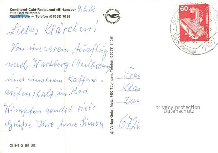 74143462 alte Postkarte Bad Wimpfen Neckar Konditorei Café Restaurant Birkensee postalisch gelaufen Erhaltung siehe scans [SanaeD93] KatCode: 11110008125007