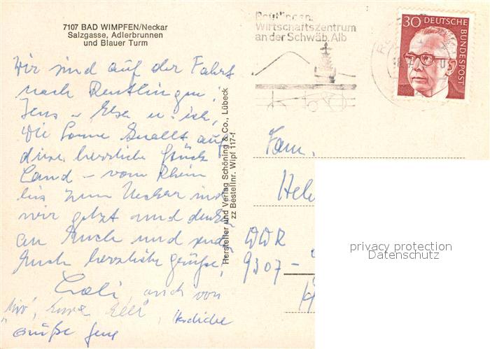 72976120 alte Postkarte Bad Wimpfen Salzgasse Adlerbrunnen Blauer-Turm postalisch gelaufen Erhaltung siehe scans [LiesaD40] KatCode: 11110008125007