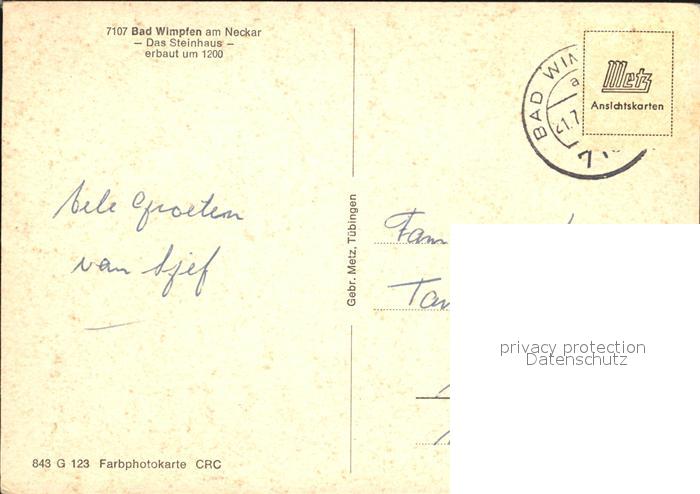 72579338 alte Postkarte Bad Wimpfen Steinhaus erbaut um 1200 postalisch gelaufen Erhaltung siehe scans [LiesaD40] KatCode: 11110008125007