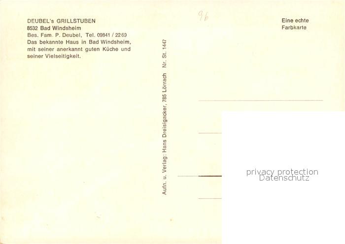 73570320 Bad Windsheim Deubel’s Grillstuben postalisch nicht gelaufen Erhaltung siehe scans [PaolaD17] KatCode: 11110009575112