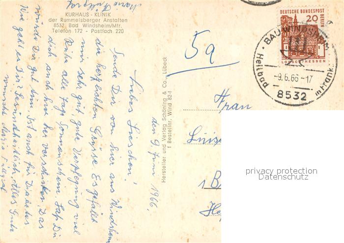 73730792 alte Postkarte Bad Windsheim Kurhaus Klinik Restaurant Park postalisch gelaufen Erhaltung siehe scans [FriedD77] KatCode: 11110009575112