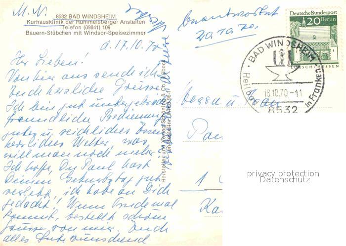72662523 alte Postkarte Bad Windsheim Kurhausklinik Bauern-Stuebchen Windsor-Speisezimmer postalisch gelaufen Erhaltung siehe scans [NatalD47] KatCode: 11110009575112